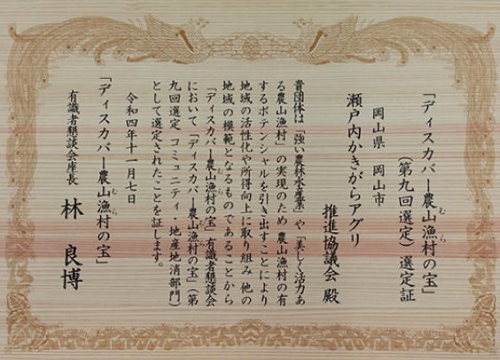 第9回選定では全国から616件の申込の中から「瀬戸内かきがらアグリ」が見事「優秀賞」を受賞しました。