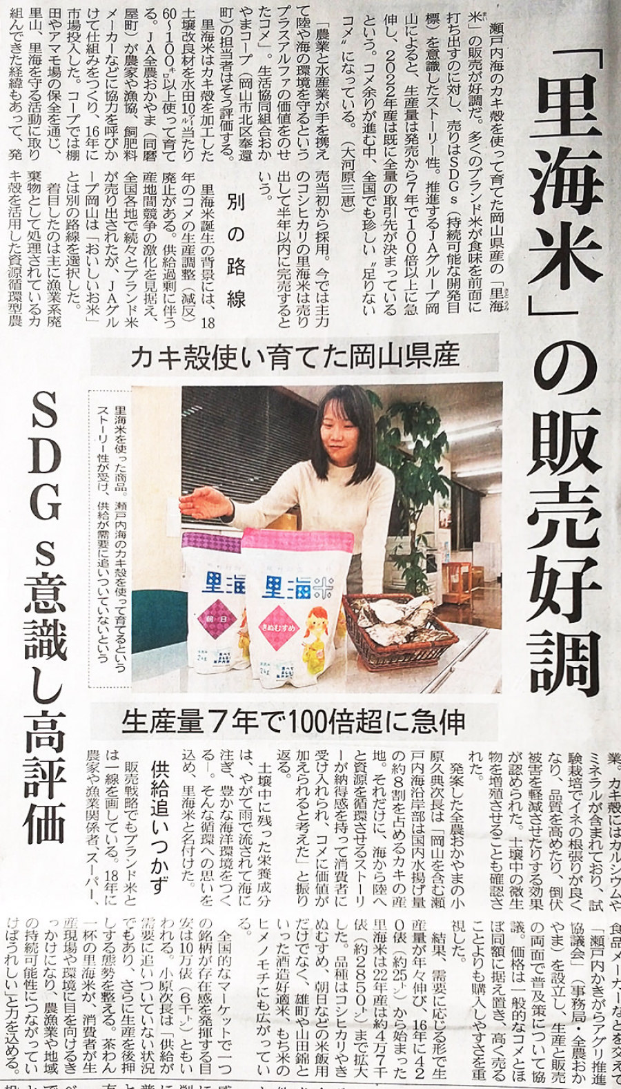 お知らせ お知らせ一覧へ 2023.1.20 令和5年産での里海米生産拡大・生産者の募集について 先日、地元紙の山陽新聞に「「里海米」の販売好調」との見出しで、「里海米」の生産量は7年で100倍超に急伸と掲載されましたが、2022年産米はすでに全量の取引先が決まっており、供給が需要に追い付いていない状況です。岡山で里海米の生産を希望される方、少しでも興味がある方は是非こちら(里海米生産者募集)をご覧ください。 2023年1月9日 山陽新聞 (画像をクリックすると拡大表示します)